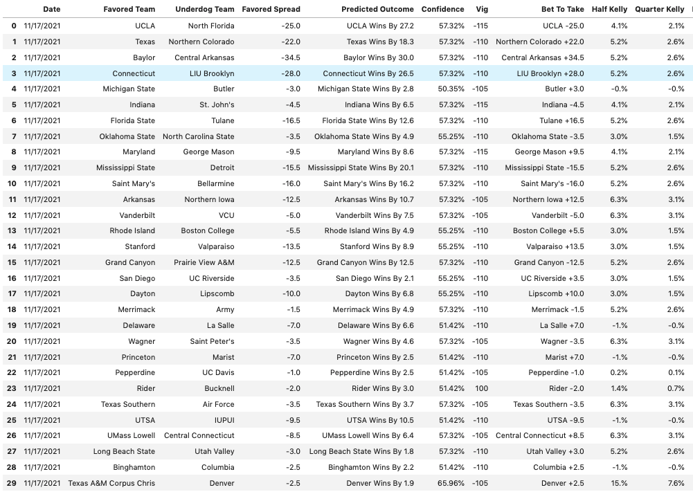 Algo Corner – 11/17/21 November 17, 2021 November 17, 2021 / By Team Action Happy Wednesday. Day 2 of the College Hoops Model after it went 70% yesterday.